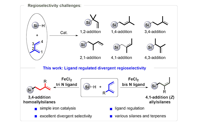 陈庆安团队一直致力于异戊二烯的区域选择性调控(Angew. Chem. Int. Ed. 2019, 58, 5438;Chem. Sci. 2019, 10, 9560;Chin. J. Catal. 2020, 41, 1401)。该团队在前期“金属—氢”调控的基础上,最近又发展了一种新颖的“配体调控”策略:以廉价二价铁为活性催化剂中心,围绕调控其配位环境为核心思想,分别设计了三齿和双齿吡啶亚胺类配体。他们发现,三齿配体可以促进硅氢化反应在异戊二烯的3,4位进行,得到高烯丙基硅化合物;而双齿配体则使得区域选择性变为4,1-加成,得到烯丙基硅化合物。该工作对于通过调控金属配位环境来改变选择性有很好的借鉴作用。