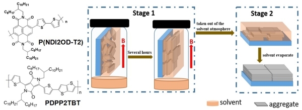 图1.(a) 半导体聚合物P(NDI2OD-T2)和PDPP2TBT的分子结构;(b)强磁场诱导溶剂蒸汽退火(SVA-HMF)生长取向薄膜的过程示意图
