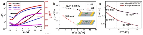 图2.(a)基于磁致取向P(NDI2OD-T2)薄膜的TG/BC和BG/BC型OFET器件的转移曲线;(b-c)P(NDI2OD-T2)(b)和PDPP2TBT(c)取向薄膜OFET的载流子迁移率随温度的变化关系