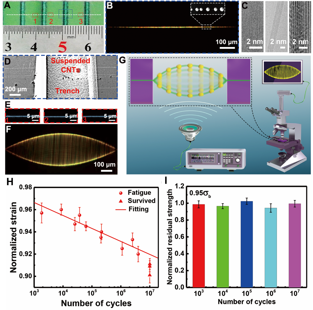 超长碳纳米管的耐疲劳性能.(A-E)厘米级超长碳纳米管样品;(F-G)非接触式声学共振测试系统机理示意图;(H-I)超长碳纳米管的耐疲劳性能。