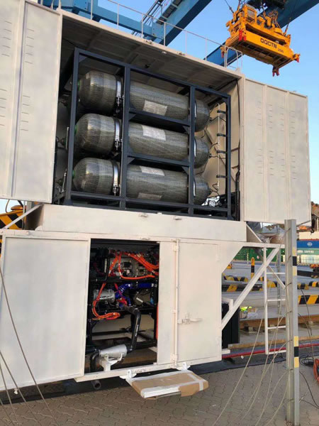 直到3月25日,张伟的团队才顺利将产品运到青岛港,“我们在青岛待了接近两个月,这样的项目在此之前没有先例,完全没有经验可以借鉴,一切都在摸着石头过河,跟各家合作单位不断磨合,不断解决出现的问题。”张伟说。自从燃料电池系统装机调试以来,运行正常,得到了用户高度评价。