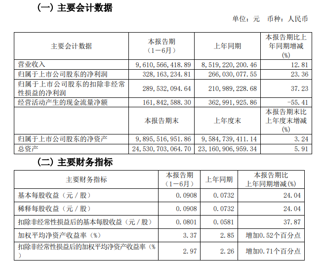 据北方稀土公布的半年度报告显示,公司报告期实现营业收入96.11亿元,同比增长12.81%;实现归属于上市公司股东的净利润3.28亿元,同比增长23.36%;业绩表现保持行业前列。