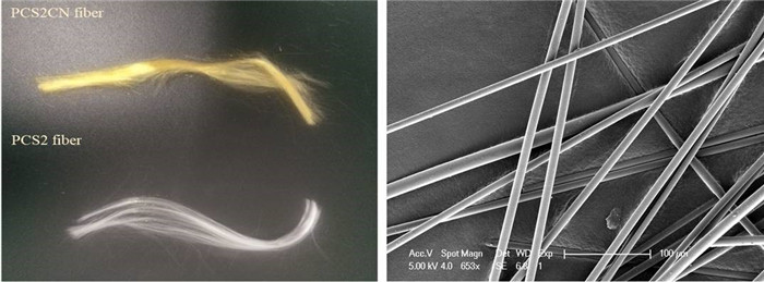 图 PCS与PCSCN纤维生丝(左)和陶瓷化的SiC纤维照片(右)