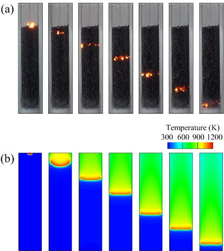 炽燃锋面的蔓延:(a)实验现象、(b)模拟结果
