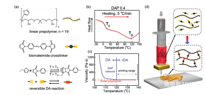 DA基聚合物基本上能够通过加热诱导的共价键解离进行自我修复,释放出呋喃和马来酰亚胺基团,从而修复其受损网络。利用这种可逆的共价DA反应,研究人员产生了一个可重印的共价交联聚合物网络家族。