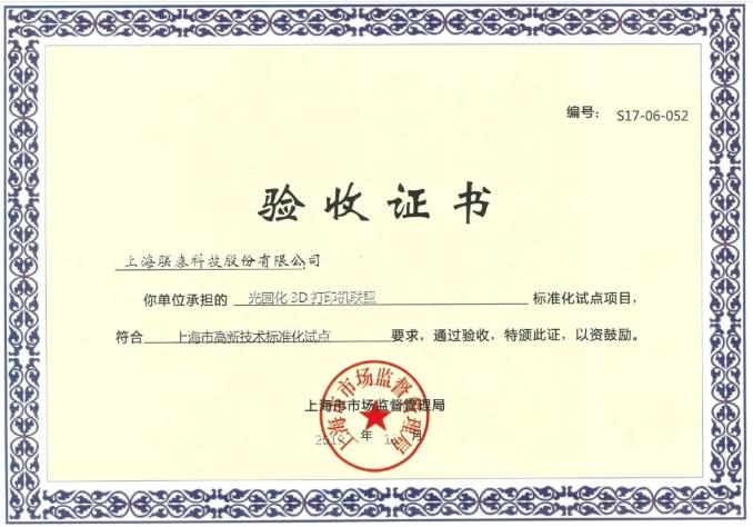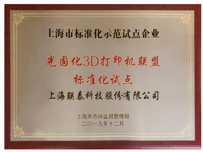 历经二年多的努力,经过专家组讨论评审、上海市市场监督管理局认定、网上公示等程序,最终联泰科技被认定为“上海市标准化示范试点企业”。标准化对于促进3D打印技术和产业的发展意义重大,该项目力争填补3D打印行业标准空白,也是3D打印行业在落实标准化改革,引导企业探索标准创新方面的新亮点。
