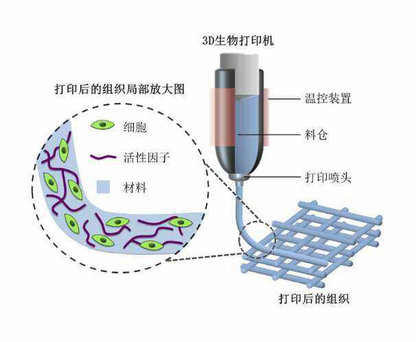 生物打印机逐层喷涂“生物墨水”,是3D生物打印的核心环节。想要创造人体的皮肤组织、软骨乃至心脏等组织,必须有完美的打印材料来支持。而材料学的配套发展进度却不尽如人意。