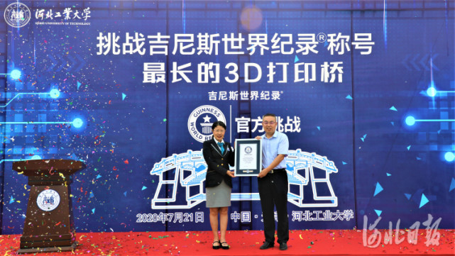 7月21日,河北工业大学装配式混凝土3D打印赵州桥,成功挑战吉尼斯世界纪录,获“最长的3D打印桥”认证。吉尼斯认证官吴晓红女士为记录创造者、河工大马国伟教授团队颁发认证证书。