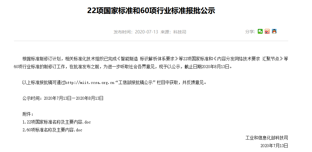 根据标准制修订计划,相关标准化技术组织已完成《智能制造 标识解析体系要求》等22项国家标准和《内容分发网络技术要求 汇聚节点》等60项行业标准的制修订工作,在批准发布之前,为进一步听取社会各界意见,现予以公示,截止日期8月13日。