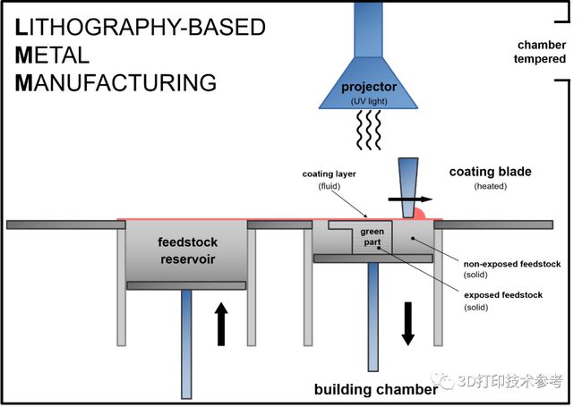 LMM技术根据光聚合原理生产高精度零件生坯,其原料为金属粉末和光敏聚合物的混合体。通过掩模曝光,可以精确快速地成型整个层面,聚合物粘结剂选择性的在局部交联,将金属粉末粘结在一起。打印完的生坯经历脱脂和烧结后可以形成致密化的零件。