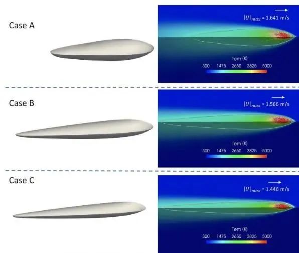 △在准稳态(2 微秒)下,由物理信息神经网络 (PINN) 预测的熔池形状以及温度和熔池流速,适用于情况 A、B 和 C