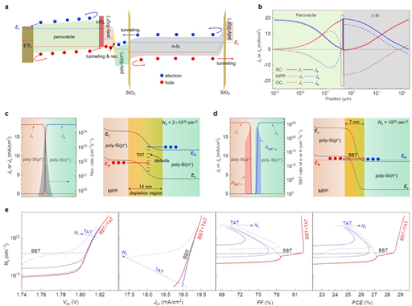 此外,通过详细的有限元仿真,科研人员对这种隧穿叠层电池的载流子传输和复合机制,进行了全面剖析(图5)。研究表明,这种隧穿复合层以陷阱辅助复合隧穿和带带隧穿为主。当多晶硅的掺杂浓度较低时(<4×1019 cm-3),p型多晶硅的价带和n型多晶硅的导带不会发生交叠,因而不会触发带带隧穿,此时陷阱辅助复合隧穿占主导。这种情况下,较高的缺陷浓度有助于陷阱辅助复合隧穿效应,从而提升叠层电池性能。当多晶硅的掺杂浓度较高时(>4×1019 cm-3),p型多晶硅的价带和n型多晶硅的导带发生交叠,触发带带隧穿,此时带带隧穿占主导。相比于陷阱辅助复合隧穿,带带隧穿更利于获得更高的填充因子和效率。因此,如何通过掺杂控制中间层的隧穿和复合效率至关重要。上述关于中间层的设计及相关机理研究,为钙钛矿/晶硅叠层太阳能电池的性能提升提供了新途径。这一设计思路同样适用于以异质结作为底电池的钙钛矿叠层电池。