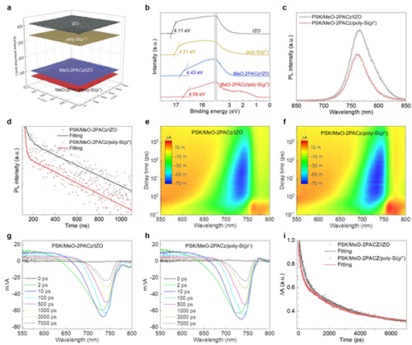 该团队创新性地将具有隧穿特性的p型多晶硅/n型多晶硅结构引入到叠层电池,用以取代传统ITO中间层,制备出效率高达29.22%的钙钛矿/TOPCon叠层电池。这种叠层器件表现出良好的稳定性(图1)。相较于传统的ITO中间复合层,这种新型隧穿复合层具有如下优势。第一、通过有效抑制p型多晶硅中硼和/n型多晶硅中磷掺杂剂的相互扩散和补偿,新型隧穿结的TOPCon结构展示出优异的钝化和接触性能(图2)。此外,这种新型隧穿结的TOPCon电池与传统TOPCon电池相比,其开路电压提升了8mV,表明增加一层p型多晶硅可以保持TOPCon电池的高性能。第二、对于钙钛矿顶电池,通过第一性原理计算、红外和XPS等测试证实钙钛矿顶电池的MeO-2PACz空穴传输层更易吸附在p型多晶硅上(图3),有助于对顶电池载流子的提取。第三、UPS等测试证实p型多晶硅具有比传统ITO更高的功函数,可进一步增强载流子传输和提取能力(图4)。