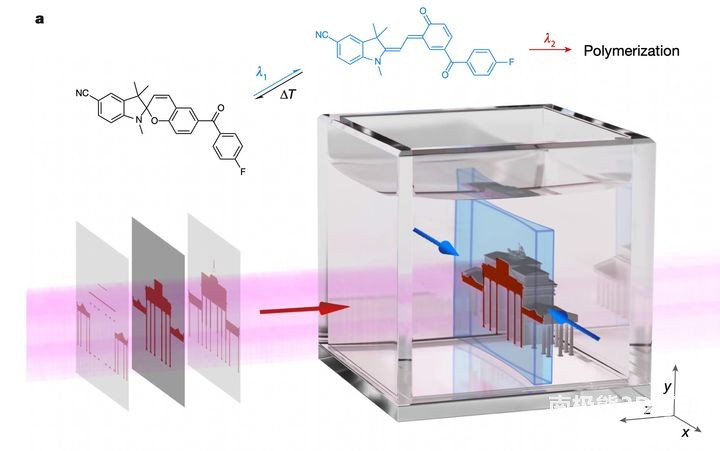 在一缸树脂中,应用两种不同波长的射线。第一波长“激活”一个区域,然后第二个相交的波长会导致被激活的树脂聚合凝固。或者是可以抑制聚合!
