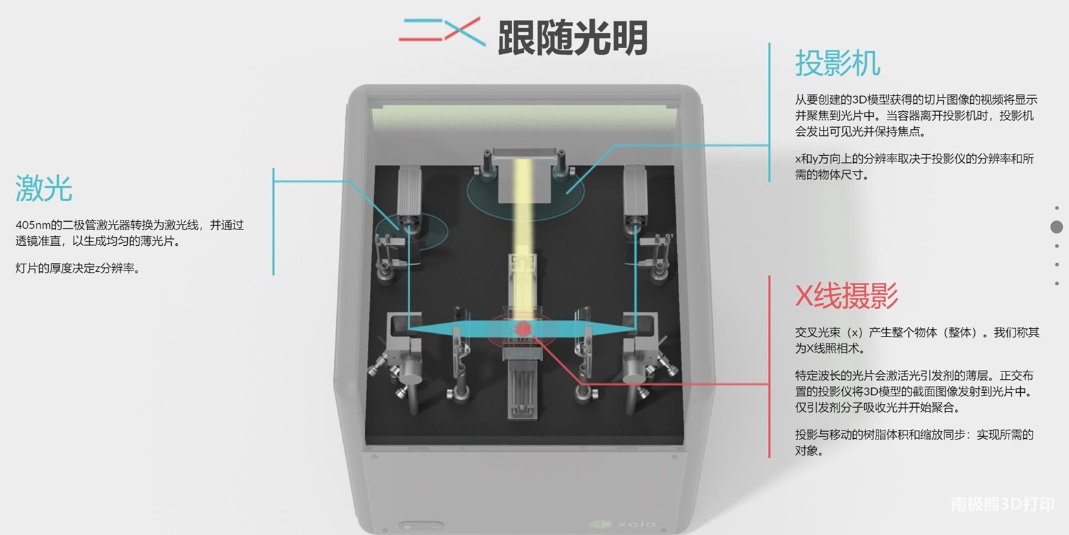 X线照相:交叉光束(x)产生整个物体(整体)。称其为X线照相术。特定波长的光片会激活光引发剂的薄层。正交布置的投影仪将3D模型的截面图像发射到光片中。只有引发剂分子吸收光并开始聚合。投影与移动的树脂体积和缩放同步,从而实现3D打印。