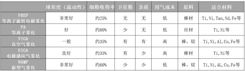 金属3D打印要求粉末粒径细小、粒度分布较窄、球形度高、流动性好和松装密度高,当前制备方法主要有等离子旋转电极法(PREP)、等离子雾化法(PA)、气雾化法(GA)。以上金属粉末制备方法的工序如下: