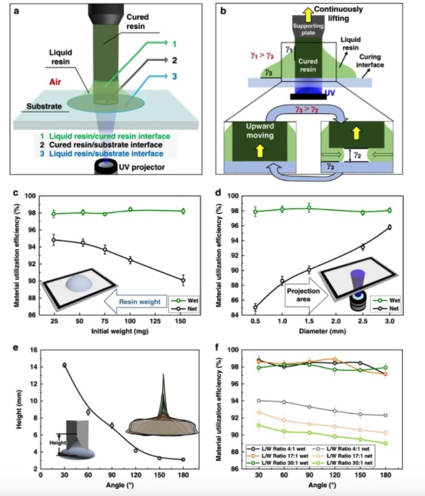 从界面的角度来看,基体的化学成分和表面粗糙度对三相接触线(TCL)的动态有很大的影响。根据对天然莲花和猪笼草表面的观察,表面的空气或液体会大大降低界面在基底上的粘附,从而导致液滴的球形接触或液体接触这些表面时的滑动现象。研究人员受这些现象的启发,展示了一种从单个液滴中制造三维结构的界面操作方法,具有较高的材料利用率。该系统采用低液体树脂附着力和低固化树脂附着力的固化界面,使3D打印过程具有可伸缩的三相接触线。有效地减少了印刷过程中残留树脂的量,树脂利用率显著提高。此外,该工艺也防止了在高打印速度下高紫外线强度所造成的额外固化。