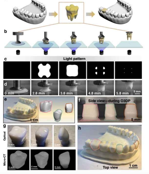 在材料利用效率提高的鼓舞下,研究人员进一步展示了单液滴3D打印工艺在打印牙齿结构方面的能力,如Figure4。通过在固化界面上连续投影逐层的UV图,牙齿结构可以连续固化,而树脂滴的TCL在固化界面上不断消退。