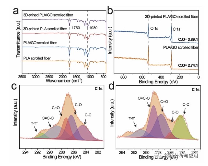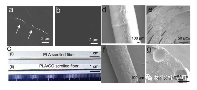 图3。PLA / GO滚动纤维和3D打印纤维的表征。