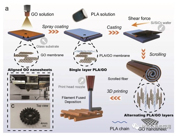 哈尔滨工业大学钟晶课题组在《Carbon》期刊发表名为“3D Printing of Graphene Oxide Composites with Well Controlled Alignment”的论文,研究报告了在不对GO进行任何修改的情况下大规模对准氧化石墨烯(GO)的通用方法。该方法包括将GO纳米片与聚合物(用于演示的聚乳酸(PLA))薄膜层压在一起,进行滚动,然后通过灯丝熔融沉积技术进行3D打印。在印刷灯丝,GO纳米片在灯丝轴向对准,在此基础上GO取向可以容易地控制经由丝熔合沉积的路径。我们显示,PLA / GO涡旋纤维和石墨烯含量为0.4 wt%的印花纤维表现出出色的机械性能,强度分别增加了约32.7%和35.2%,这显着高于具有随机石墨烯分布的类似纳米复合材料,表明聚合物得到了大大改善加固效率。所提出的带有3D打印框架的滚动纤维可以广泛地应用于各种2D材料和结构复合材料。