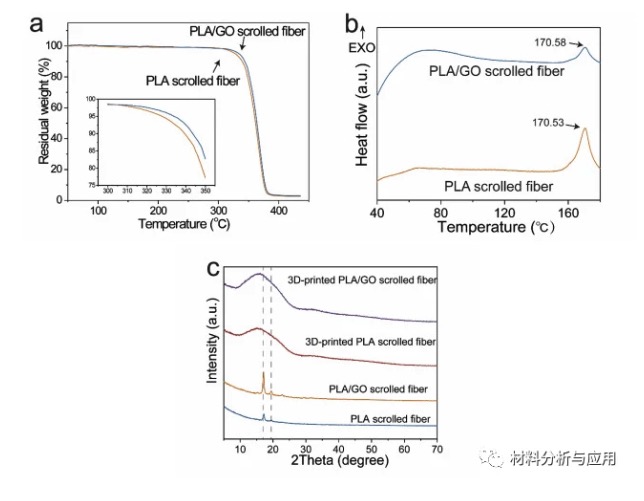 图4。(a和b)分别在N 2气氛下,PLA涡旋纤维和PLA / GO涡旋纤维的TG和DSC曲线比较。(c)PLA / GO滚动纤维和3D打印纤维的XRD图样研究。