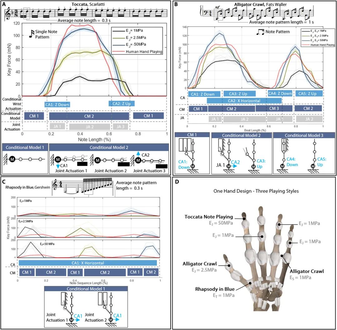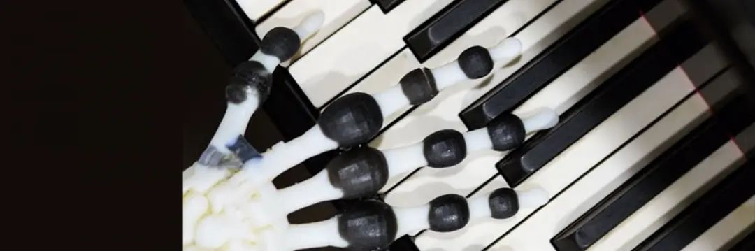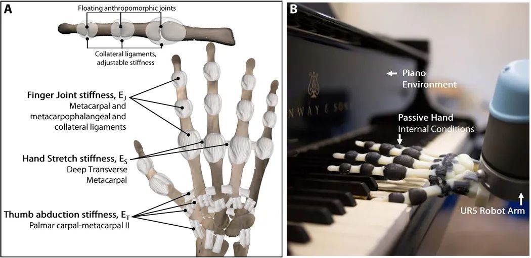 打印的机械手指及其打印的手指正在弹钢琴图解:这一手指打印出来的尺度同真人一样大小:(A)拟人模型的手指显示手指分三组韧带,会影响人类原始行为的三个部分进行了研究;(B)3D打印的手指具有条件刚度系统 ,安装在UR5机器人上,提供外部驱动,从而实现弹钢琴的动作