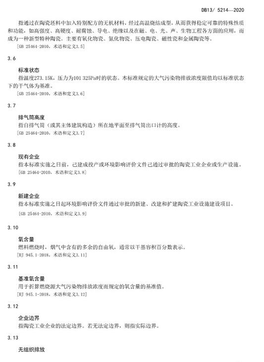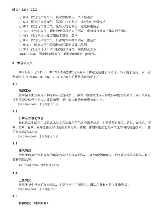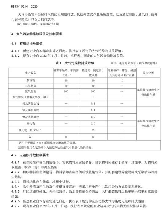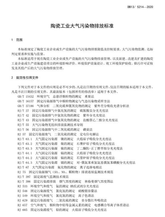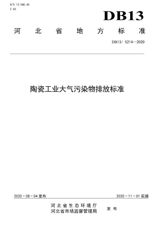 日前,河北印发《陶瓷工业大气污染物排放标准》,标准于2020年11月1日起实施,新建企业自2020年11月1日起执行,现有陶瓷企业自2022年1月1日起执行新标准。