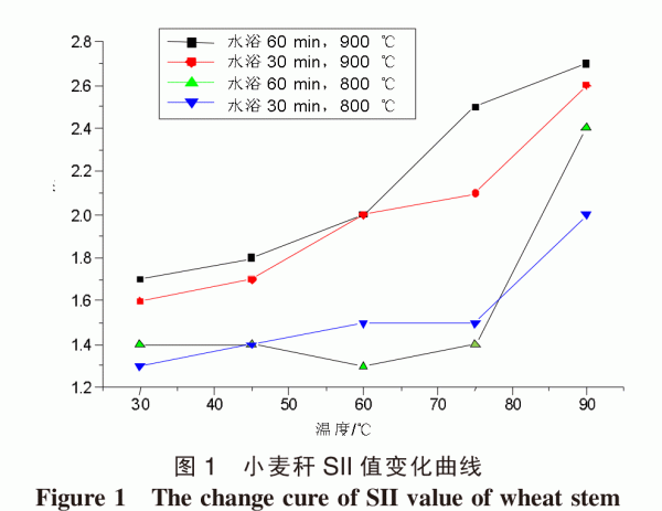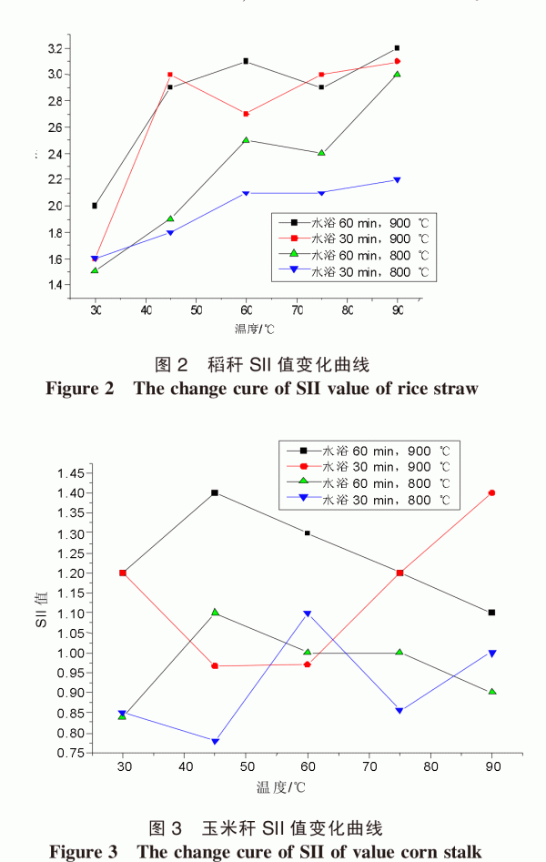 1.3.1试验过程 原料水洗预处理:将3种生物质原料分别置于烧杯中,用去离子水浸泡1~2min,捞出烘干;原料水浴预处理:将3种原料分别置于高温水浴锅中,在30,45,60,75,90℃下浸泡30min和60min。将经过预处理的原料分别在电热恒温鼓风干燥箱中干燥12h,确认干燥后取出,利用小型高速粉碎机将原料充分粉碎,然后过80目标准筛,得到小于0.2mm粉末,备用。将以上各工况下制得的秸秆试样分别在智能马弗炉中进行快速灰化,测定各个试样的烧结强度指数SII值,并对其规律性进行分析。
