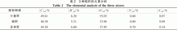 试验选用3种生物质原料:小麦秆、稻秆、玉米秆,均取自河南省新乡市,在自然条件下风干。3种秸秆原料的工业分析结果见表1,其中Mad,Aad,Vad,FCad分别为秸秆空干基水分、灰分、挥发分和固定碳的质量分数;Q为单位热量。3种秸秆原料的元素分析结果见表2。