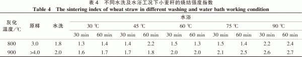 由表4和图1可以看出:小麦秆800℃灰化时,相比于原样,其水洗及水浴后烧结强度指数明显减小;但随着水浴温度升高,水浴30min和60min的SII值减小幅度均逐渐降低。水浴30min时60℃处理的缓解结渣效果最好,水浴60min时30℃效果最好。小麦秆900℃灰化时,相比于原样,其水洗及水浴后烧结强度指数明显减小;但随着水浴温度升高,水浴30min和60min的SII值减小幅度均逐渐降低,当水浴温度达到75℃后效果反而不如水洗处理。水浴30min时30℃效果最好,水浴60min时30℃效果最好。