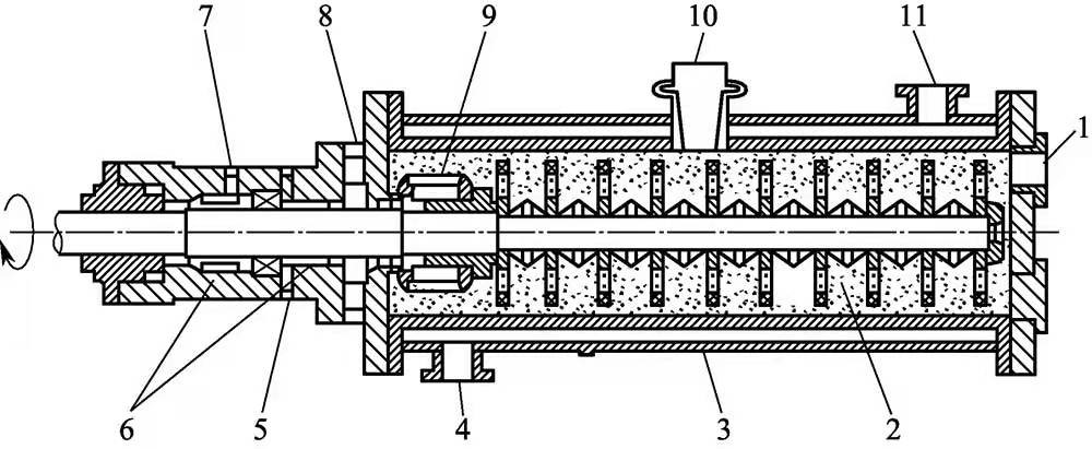 卧式螺旋卸料离心机主要由柱-锥形转鼓、螺旋推料器、行星差速器、挡料板、差速器、扭矩调节器、减振垫、布料器、外壳和机座等零件组成。