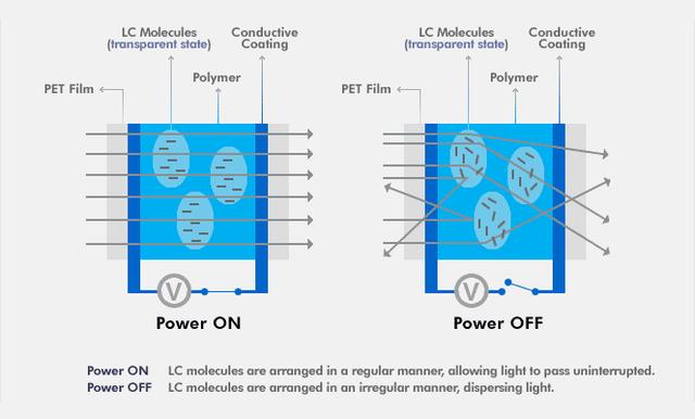 图中的PDLC膜被有透明导电玻璃(比如氧化铟锡)涂层的PET膜所包围 | 来源:glass-apps.com