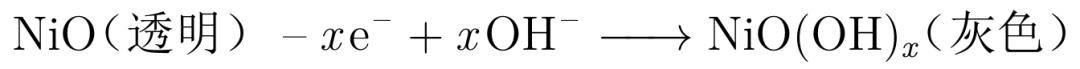 电致变色层中含有变色材料。有的变色材料在高价态显色,低价态褪色,这种叫阳极变色材料,比如NiO [4]。NiO在高价态下显灰色,当它发生下面这个反应时,电致变色玻璃就可以从透明切换到灰色。