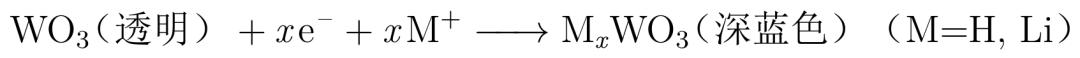 而有的变色材料则是在高价态透明,低价态时显色,这种就叫做阴极变色材料,比如说WO3[4]。WO3与H+和Li+结合后,就会由透明转变为深蓝色,从而达到变色的效果。WO3是目前应用最多,性能最好的阴极着色材料,电致变色玻璃中很多用的都是它。