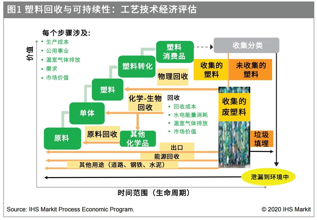 石油化工行业正面临越来越大的环境压力,必须通过增加回收来减少塑料废料。但塑料回收十分复杂,不仅涉及塑料生产商,还涉及品牌所有者、消费者、市政机关、废物管理公司和废物回收商。回收产业链、政府监管和技术发展也至关重要。为了描述这些问题并评估决定未来塑料回收率的因素,埃信华迈(IHS Markit)提出了一个能对塑料回收进行系统定量评估的工艺技术经济评估(见图1)。