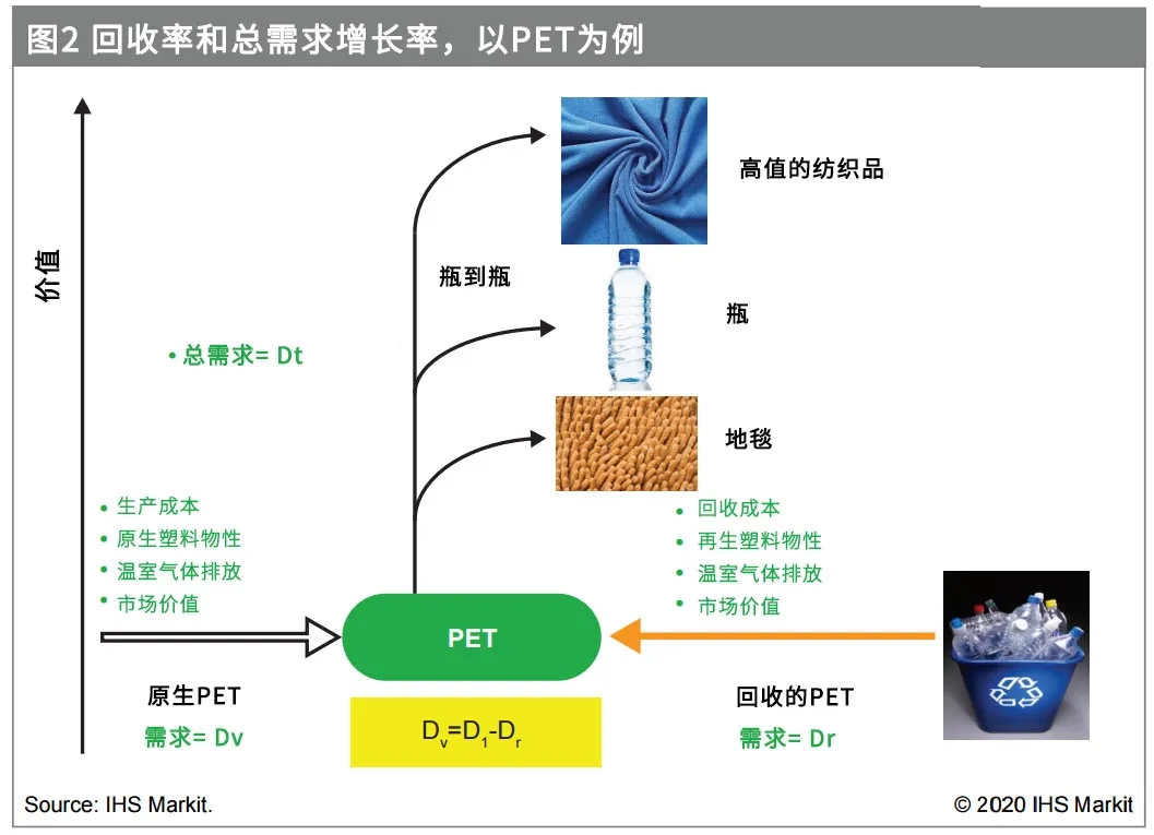 回收材料对原生塑料未来需求的影响程度取决于未来的回收率和总需求增长率。图2以聚对苯二甲酸乙二醇酯(PET)的机械回收为例阐述了这一概念。