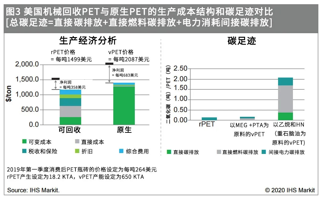 从可持续性角度来看,rPET的总碳足迹低于直接用MEG和PTA生产vPET。当MEG生产追溯到乙烷蒸汽裂解制成乙烯的环节以及芳烃联合装置中以PX(对二甲苯)和重石脑油(HN)为原料的PTA生产,rPET与vPET的可持续性差异便更为显著。