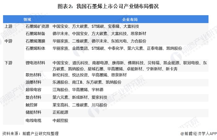 石墨烯的上游为石墨矿、甲烷等原材料,中游为石墨烯化合物、石墨烯薄膜的制造,下游为终端产品如涂料、油墨、手机、触控屏等应用。