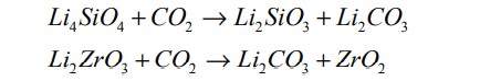 锆酸锂和硅酸锂应用于CO2捕集时,会与CO2发生化学反应,从而实现捕集的目的,其化学方程式如下: