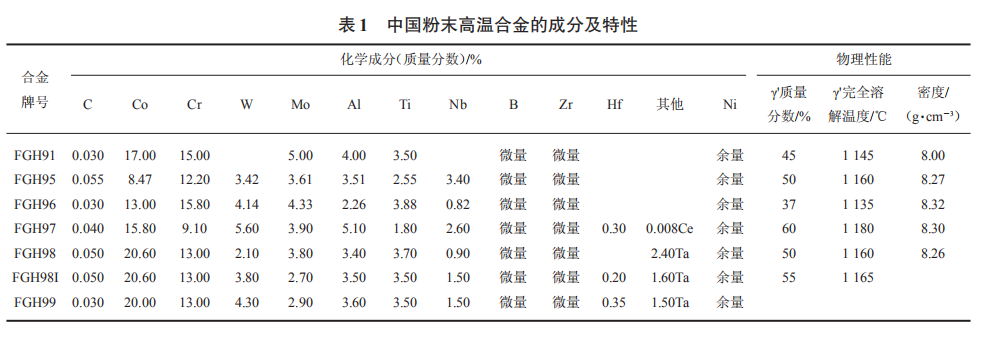 中国粉末高温合金的研究起步相对较晚,开始于20世纪70年代后期。粉末高温合金型号主要有FGH95、FGH96、FGH97、FGH98等。表1为中国几代粉末高温合金的成分及特性。