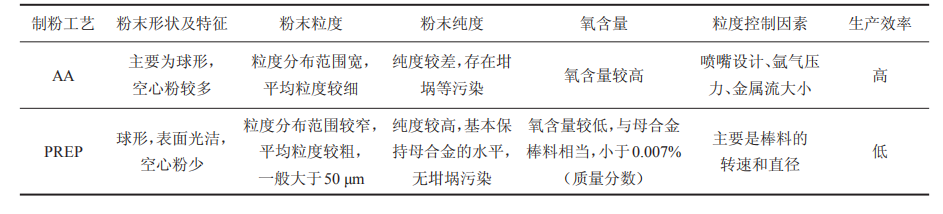 目前高温合金粉末制备主要有气雾化法制粉(AA粉)和等离子旋转电极法制粉(PREP粉)2种方法。
