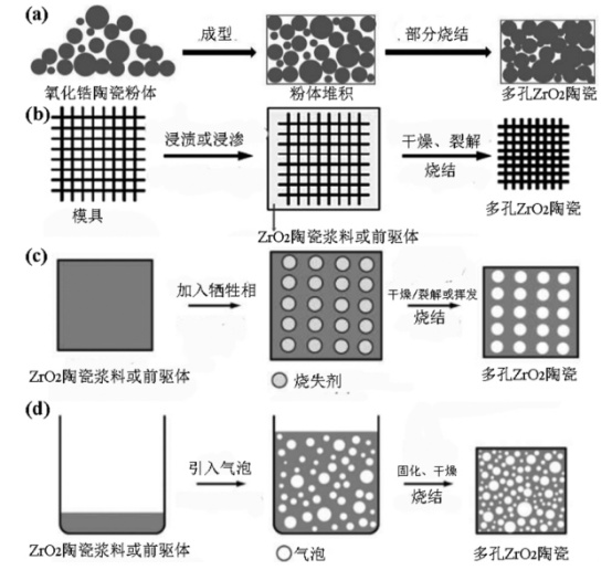 依据造孔机理的不同,可将ZrO2多孔陶瓷的制备方法分为以下四类:即颗粒堆积法、模板复制法、牺牲模板法和直接发泡法。通常,制备ZrO2 陶瓷的过程包括陶瓷颗粒均匀混料、素坯成型、素坯干燥和多孔陶瓷烧结等环节。
