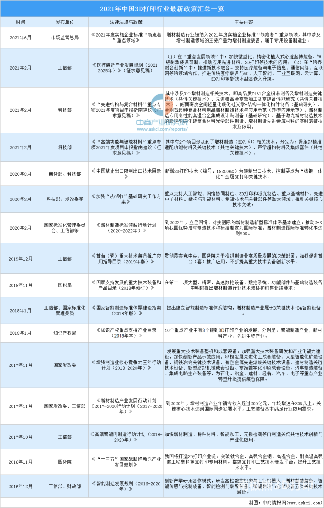 周边,在中国 3D 行业受到的人数和国家产业政策的重点支持。国务院、国家改委、工信部、科技部等多部门陆续印发了支持、规范 3D 打印行业的发展政策。 2021年度实施企业标准“领跑者”重点领域》《知识产权重点支持产业目录(2018年本)》《增材制造标准领航行动计划(2020-2022年)》等产业政策,内容涉及3D打印产业化、发展目标、应用范围、技术创新、标准规范等多方面,促进3D打印行业的发展。具体政策如下: