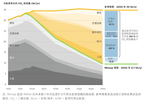 根据报告研究,在气候变化对全球减碳提出迫切需求、可再生能源引导全球能源变革的背景下,可再生能源与氢能将助力深度脱碳,在当前政策下,如果可再生能源能够加速普及,在2050年全球或可实现90%以上的与能源相关的二氧化碳减排;而根据国际氢能委员会2050年氢能愿景,氢能在终端能源需求所占比例将达到18%,欧洲氢能路线图2050年氢能愿景中这一比例则达到了24%。