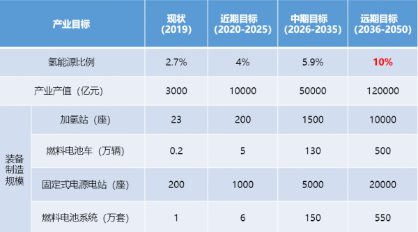 根据中国氢能联盟对氢能产业的愿景,2019年我国氢能源比例为2.7%,近期目标是于2020年-2025年提升至4%,中期目标是在2026年-2035年升至5.9%,远期目标是在2036年-2050年将其提升至10%。
