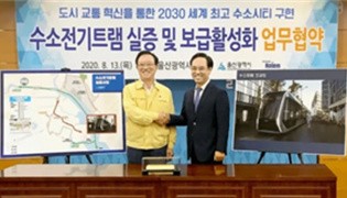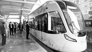 近日,在高明荷富大道上,全国首列氢能源有轨电车上轨。