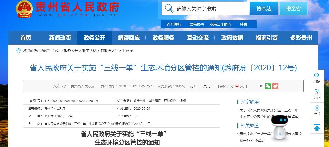 贵州省人民政府印发《关于实施“三线一单”生态环境分区...